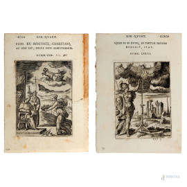 Giulio Bonasone (1498-1575), Coppia di acqueforti tratte da "Achillis Bocchii Bonon. Symbolicarum quaestionum, de vniuerso genere, quas serio ludebat, libri quinque", foglio cm 17x12, (segni di usura, tracce di umidità, restauri)
