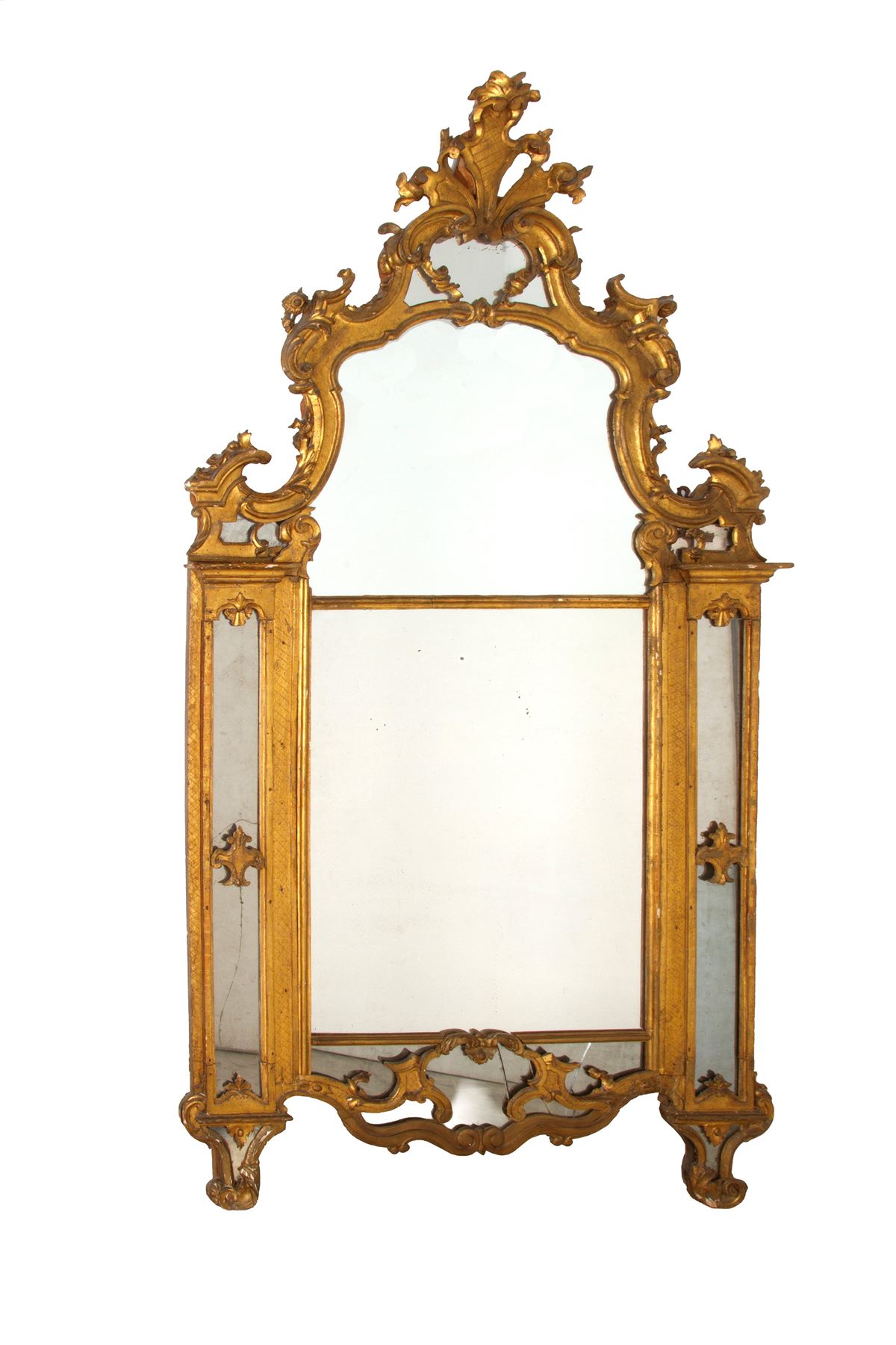 • Lot n° 0185 Specchiera - Specchiera in legno intagliato e dorato. XVIII secolo. Lievi difetti e piccole mancanze. - 215x104 cm ca. -