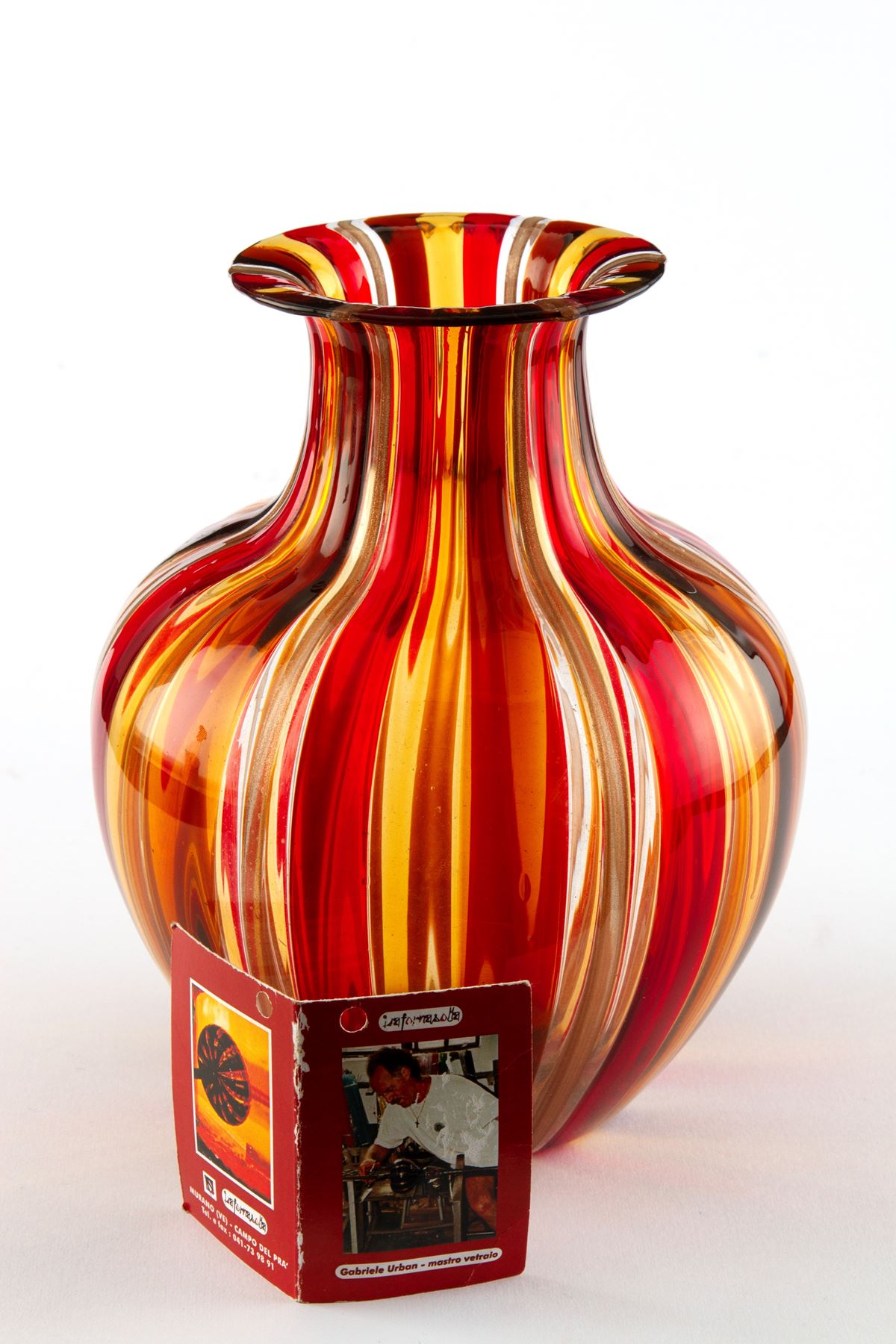 Vaso rosso striato - Vaso in vetro striato rosso, giallo e ocra. Con certificato di garanzia. - 20,5x17 cm ca. -