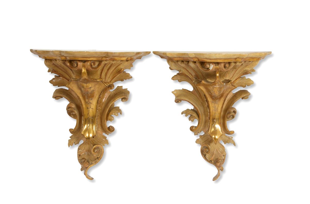 • Lot n° 0198 Coppia di mensole - Coppia di mensole in legno finemente intagliato, laccato e dorato. XIX secolo. - 53x50x31 cm ca. -