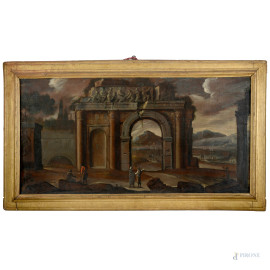 Scuola Romana del XVIII secolo, Paesaggio con architetture e rovine, olio su tela, cm 63,5x126 entro cornice