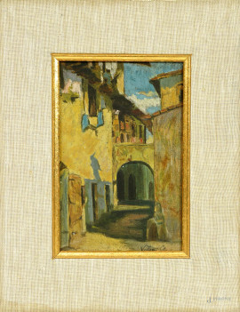 • Lot n° 0870 Strada di paese, olio su cartone telato, cm 17x11,5, firmato in basso a destra, entro passpartout