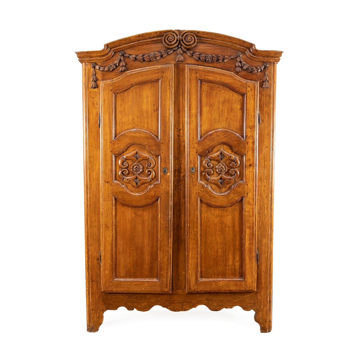 • Lot n° 0210 Armadio in massello di pioppo - fronte a due ante con decorazioni ad intaglio, cappello e base modanati - 220x146x55 cm. -