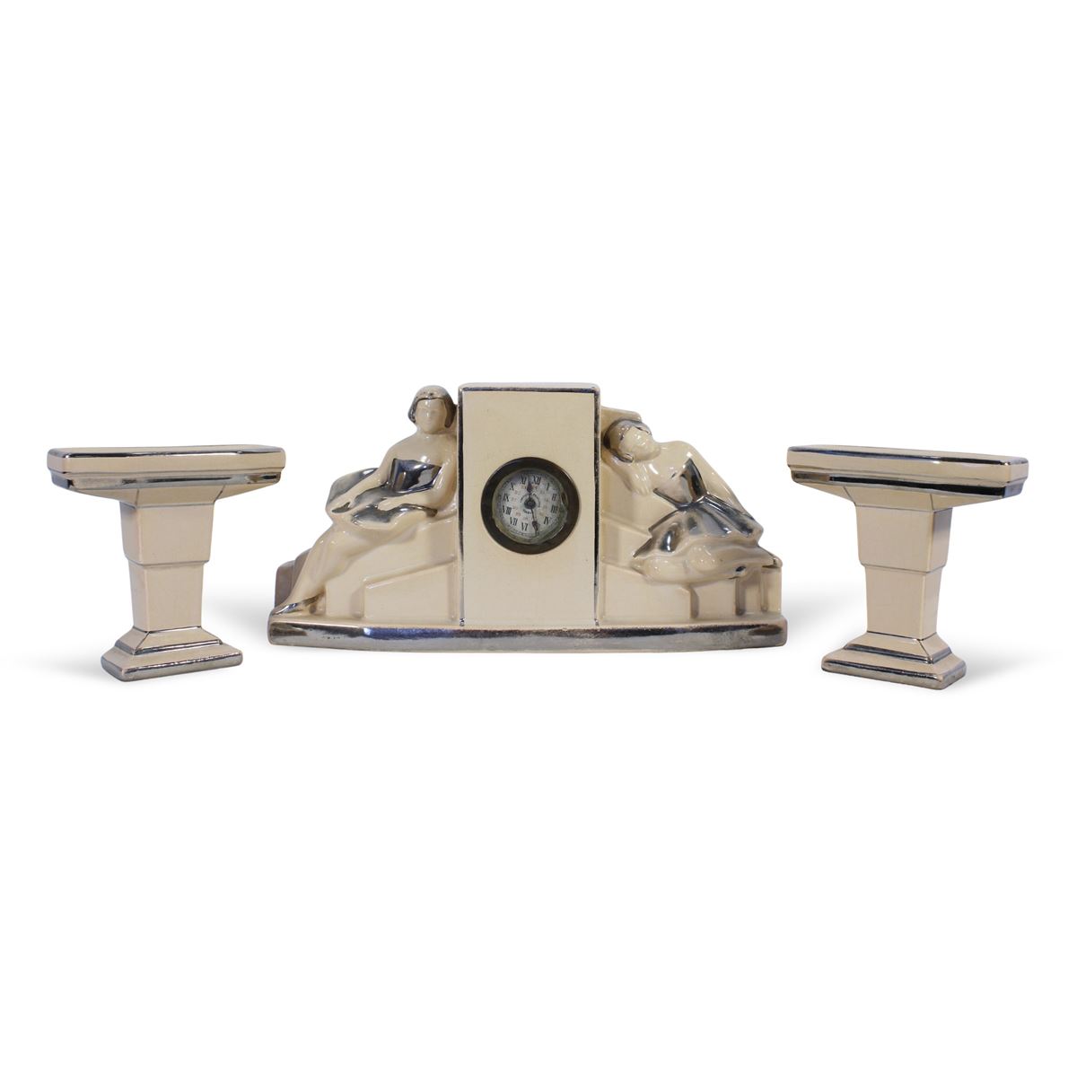 Gruppo di oggetti da camino - in ceramica smaltata composto da un orologio e due portacandele - 18x35 cm. - 14x14 cm. -
