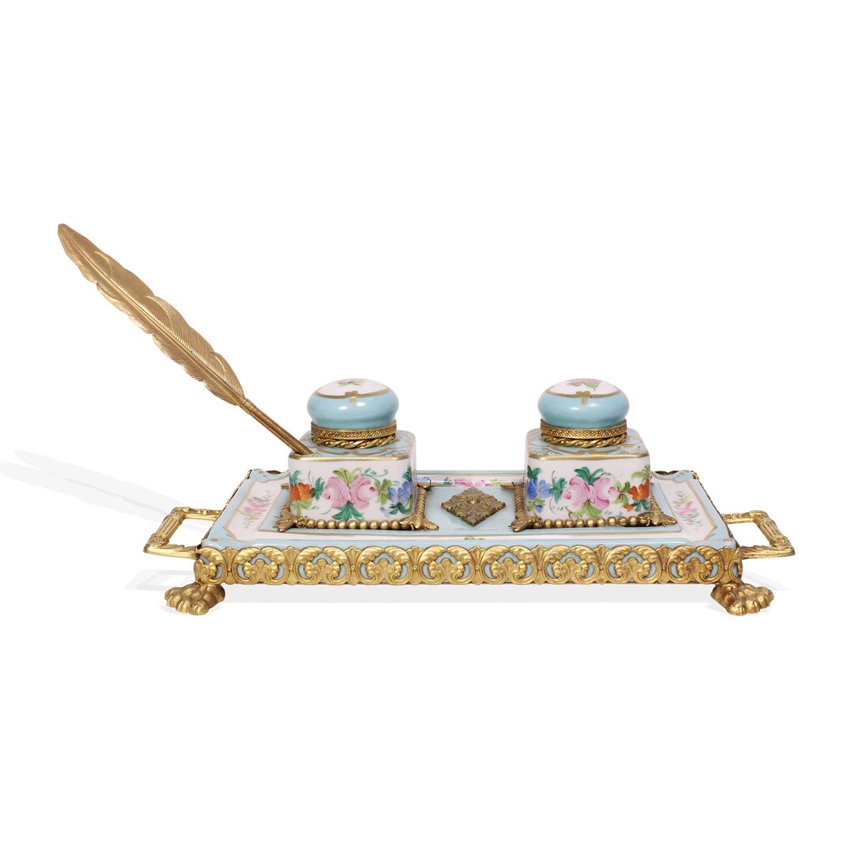 • Lot n° 0030 Manifattura Limoges - calamaio in porcellana decorato con motivi floreali, completo di piuma. Firma della produzione - 9x30 xm -