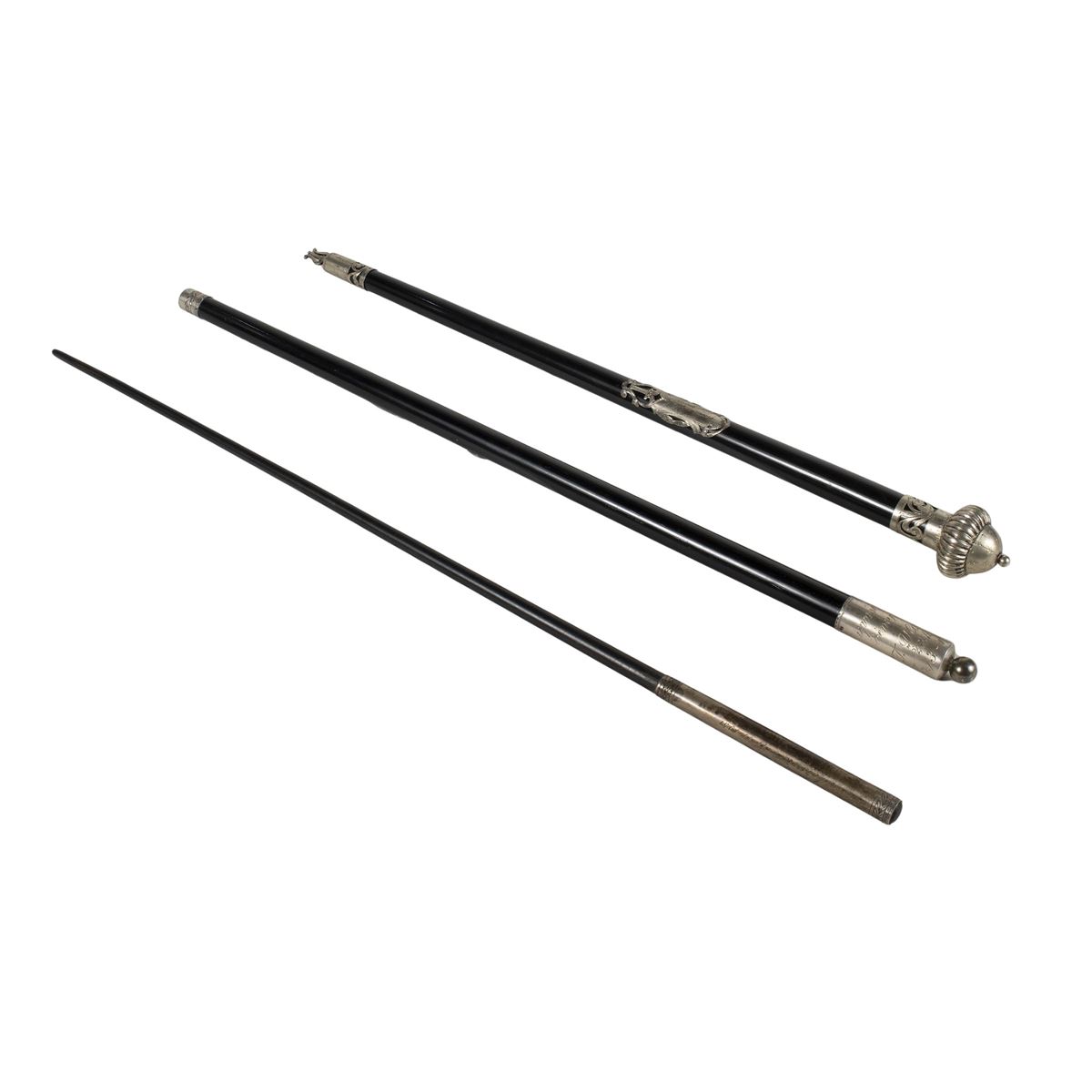 Gruppo di tre bacchette da direttore d'orchestra in legno - con presa e terminale in argento e metallo, usure - l. massima 45 cm. -