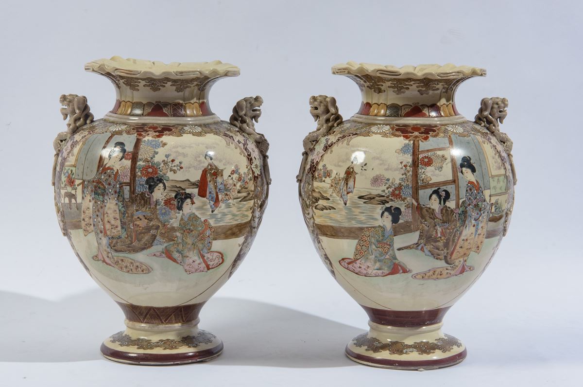 Coppia di vasi - Coppia di vasi in ceramica a bocciolo con ansa a draghi e piede circolare, fondo di color cremisi, con scena di genere orientale a fronte e a tergo bouquet di fiori - 48 x 20 cm -