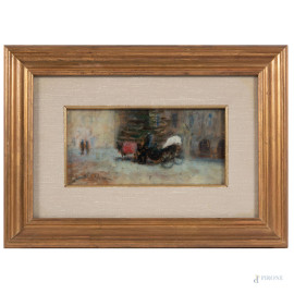 La carrozza, XIX secolo, olio su tavoletta, cm 12x24, firmato in basso a sinistra, entro cornice