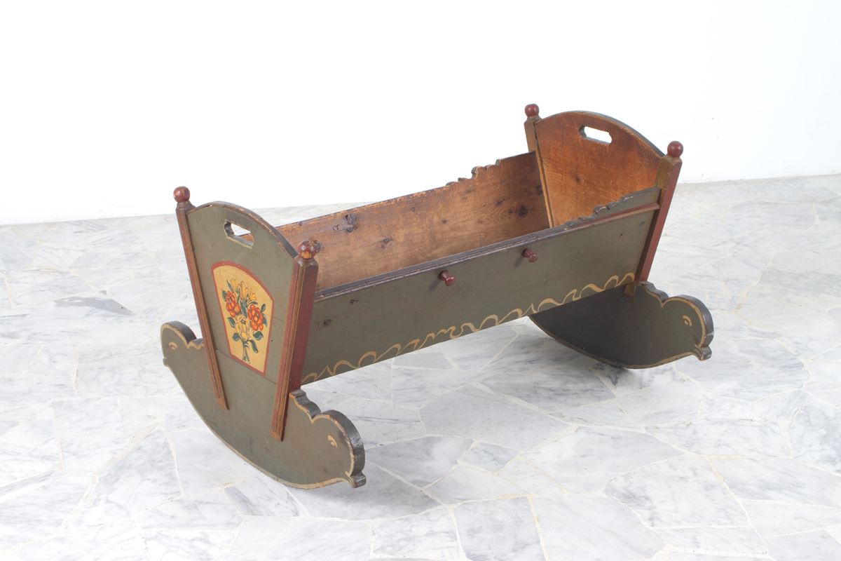 • Lot n° 0217 Culla altoatesina - Culla in legno dipinto a motivi floreali. Trentino Alto Adige. XIX secolo. Lievi difetti. - 52x89x65 cm ca. -