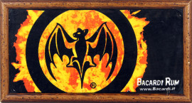 Bacardi rum, locandina su tessuto, cm 23x47, entro cornice.