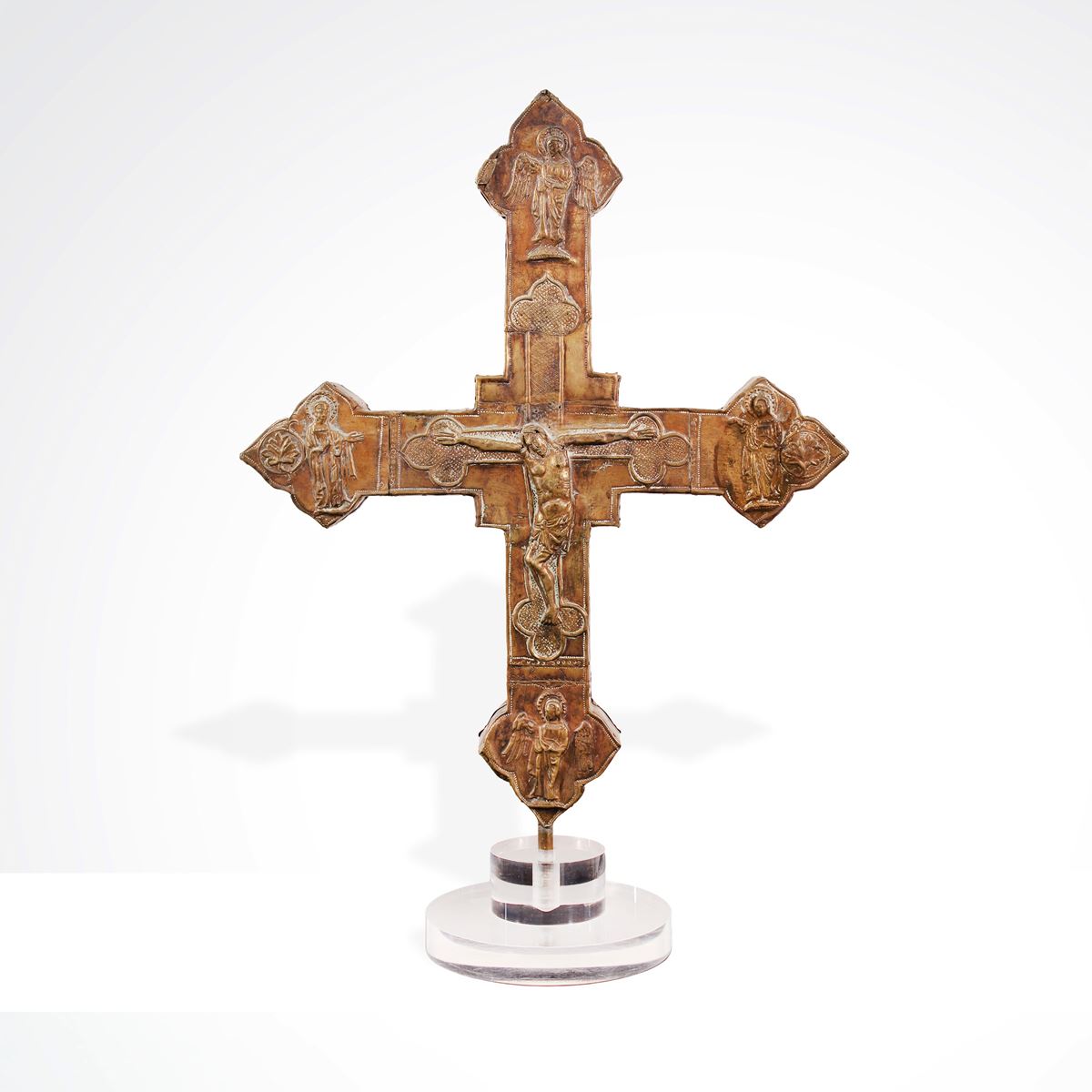 • Lot n° 0198 Croce Astile, oreficeria abruzzese - fusto in legno rivestito in lamierino sbalzato ed inciso, con raffigurate figure e simboli cristiani, un lato centrato da Cristo crocifisso con i Quattro Evangelisti ai lati, l'altro lato centrato da Madonna in trono con ai lati il leone, il toro e l'aquila alati, usure e mancanze, poggiante su base circolare in plexiglass - 65x48x4 cm. -