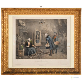 • Lot n° 0384 Un Monsieur tres poli!, stampa, XIX secolo, cm 48,5x60 compreso passepartout entro cornice, (foxing, piccole lacune, lacerazoni)