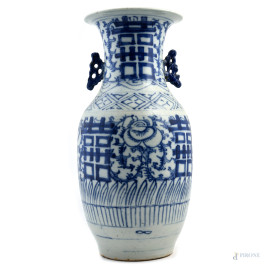 Grande vaso in porcellana dipinta e smaltata nei toni del bianco e del blu a motivi floreali e geometrici. Cina, XX secolo, altezza cm 41,5, (difetti di cottura, cadute di smalto, restauri)