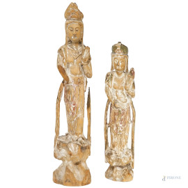 Lotto composto da due Guanin in legno scolpito e dipinto con tracce di policromia, altezza max 41,5 (difetti)
