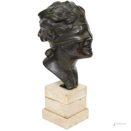 • Lot n° 0405 Scultura in metallo brunito rappresentante la dea della Fortuna, base in marmo, XX secolo, altezza cm 23