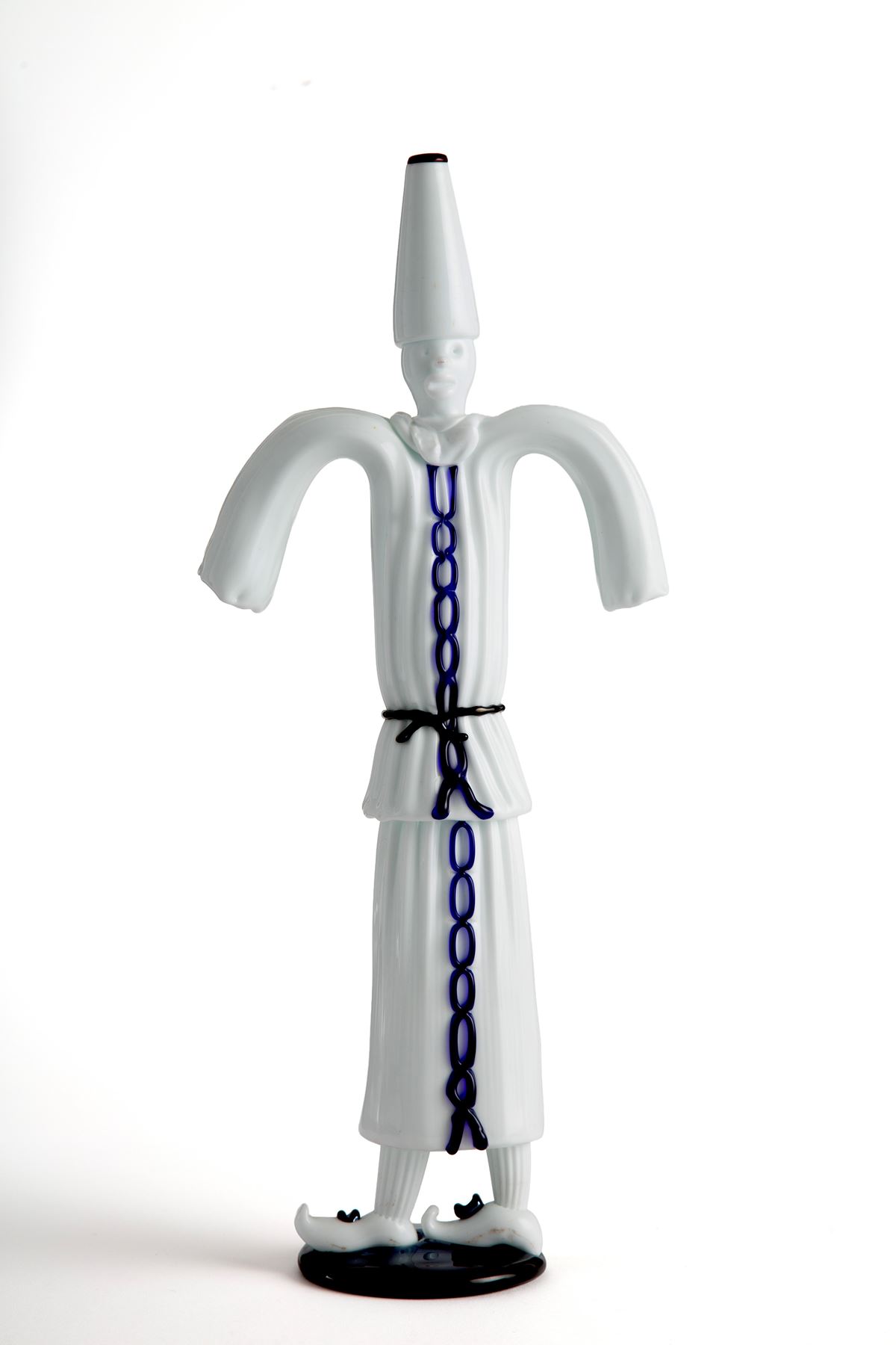 Figurina "PEPPE NAPPA" per VENINI - Figurina in vetro lattimo con finiture in vetro nero, blu e rosso raffigurante "PEPPE NAPPA". Firmata all’acido sul fondo. VENINI, Murano. 1947-48. Pubblicato in M. Barovier e C. Sonego, "Fulvio Bianconi alla Venini", ed. Skira 2015, pag. 335. - Alt. 38 cm ca. -