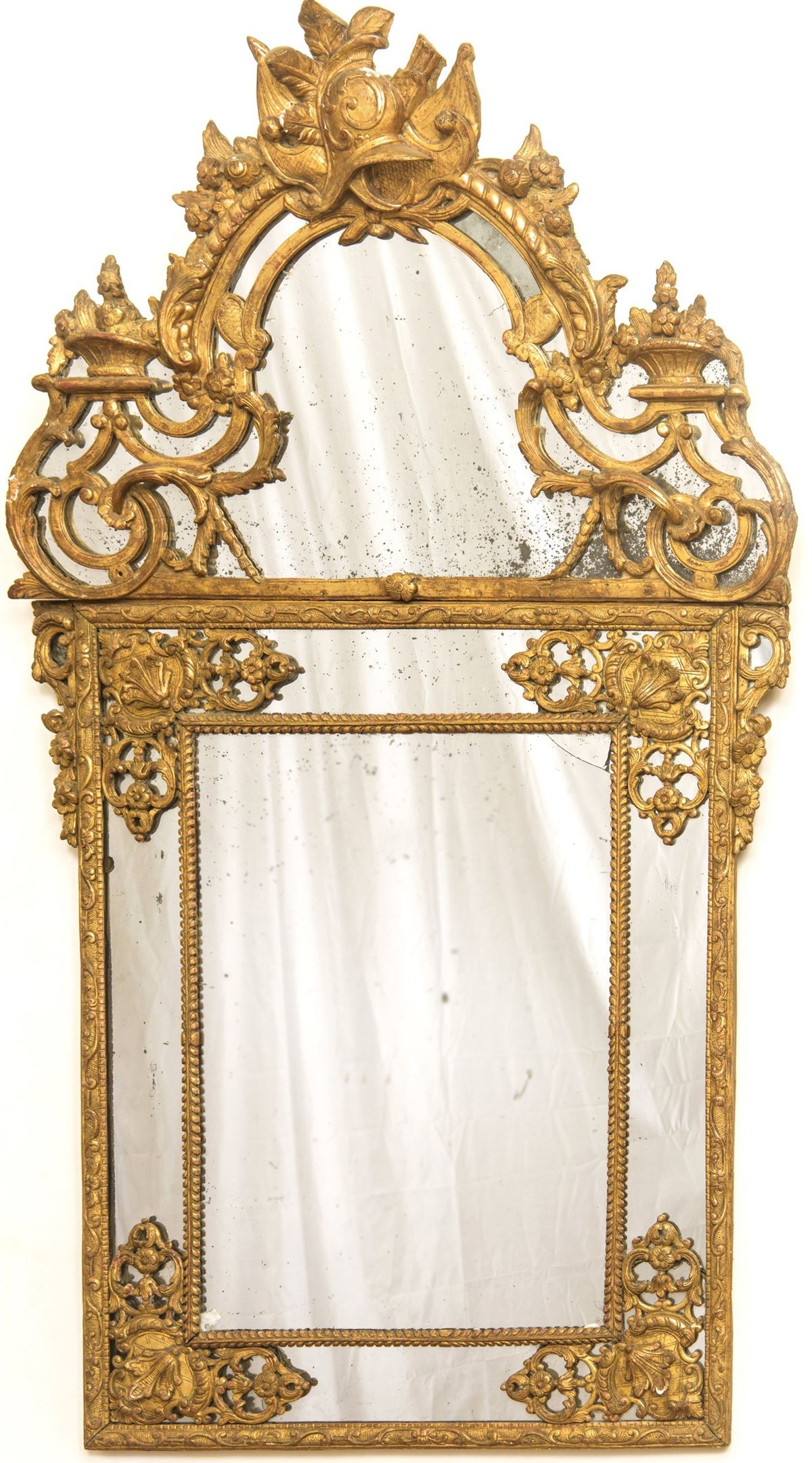 Specchiera - In legno dorato e finemente intagliato. Specchio d'origine a mercurio inserito in una doppia cornice riccamente intagliata a decorazione floreale e a tralci fogliacei. La parte superiore, composta da una grande cimasa a ghirlande e racemi, arricchita da due cesti di fiori, sormontata da un grande elmo e faretra. Presenta un piccola rottura allo specchio a destra nel registro inferiore. - 170 x 84 cm -