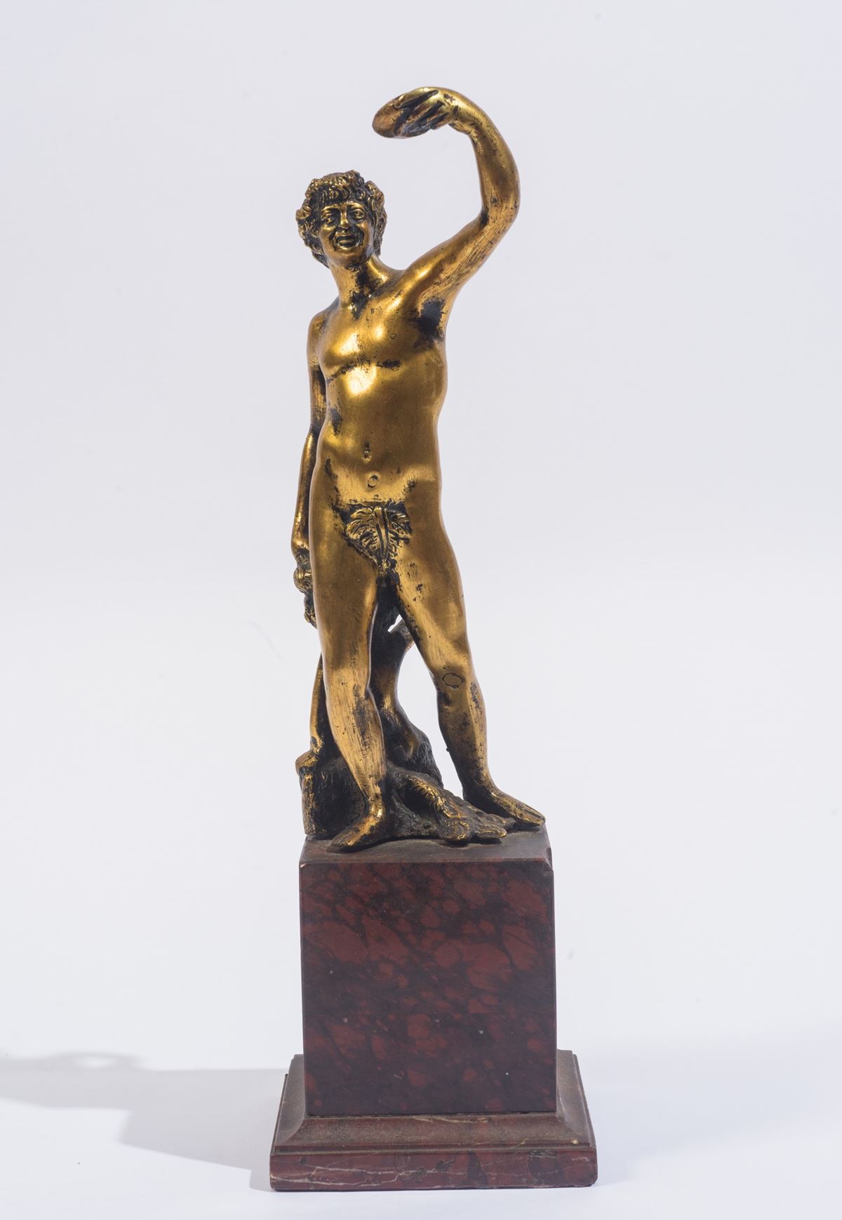 Bacco - Scultura in bronzo dorato raffigurante Bacco, ispirata al celebre modello realizzato da Jacopo Sansovino nel 1515 per Giovanni Bartolini a Firenze. L’originale è oggi conservato presso il Museo Nazionale del Bargello di Firenze.L’opera è montata su una base in marmo rosso venato (H. 12 cm) - H. 28 cm -
