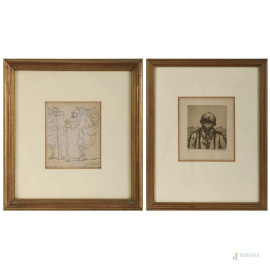 Lotto composto da un inchiostro su carta e un'incisione raffigurante soldati, XX secolo, misure massime cm 35x27 compreso passepartout