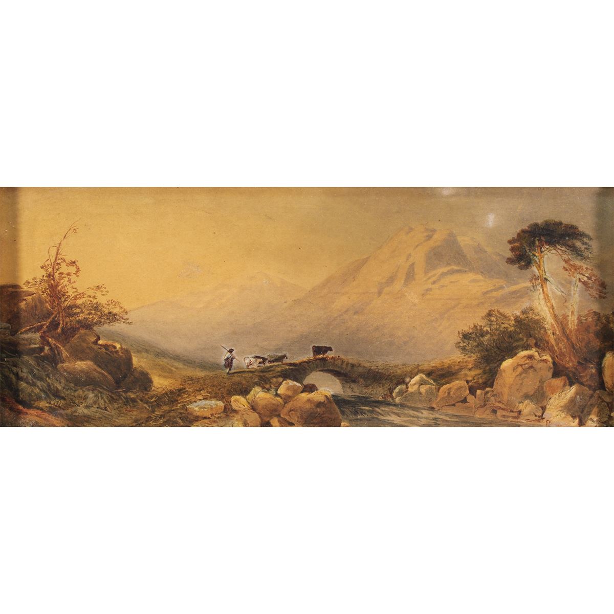 Abraham De Smidt - "Paesaggio con figure e animali", acquerello su carta - 15x37cm. -
