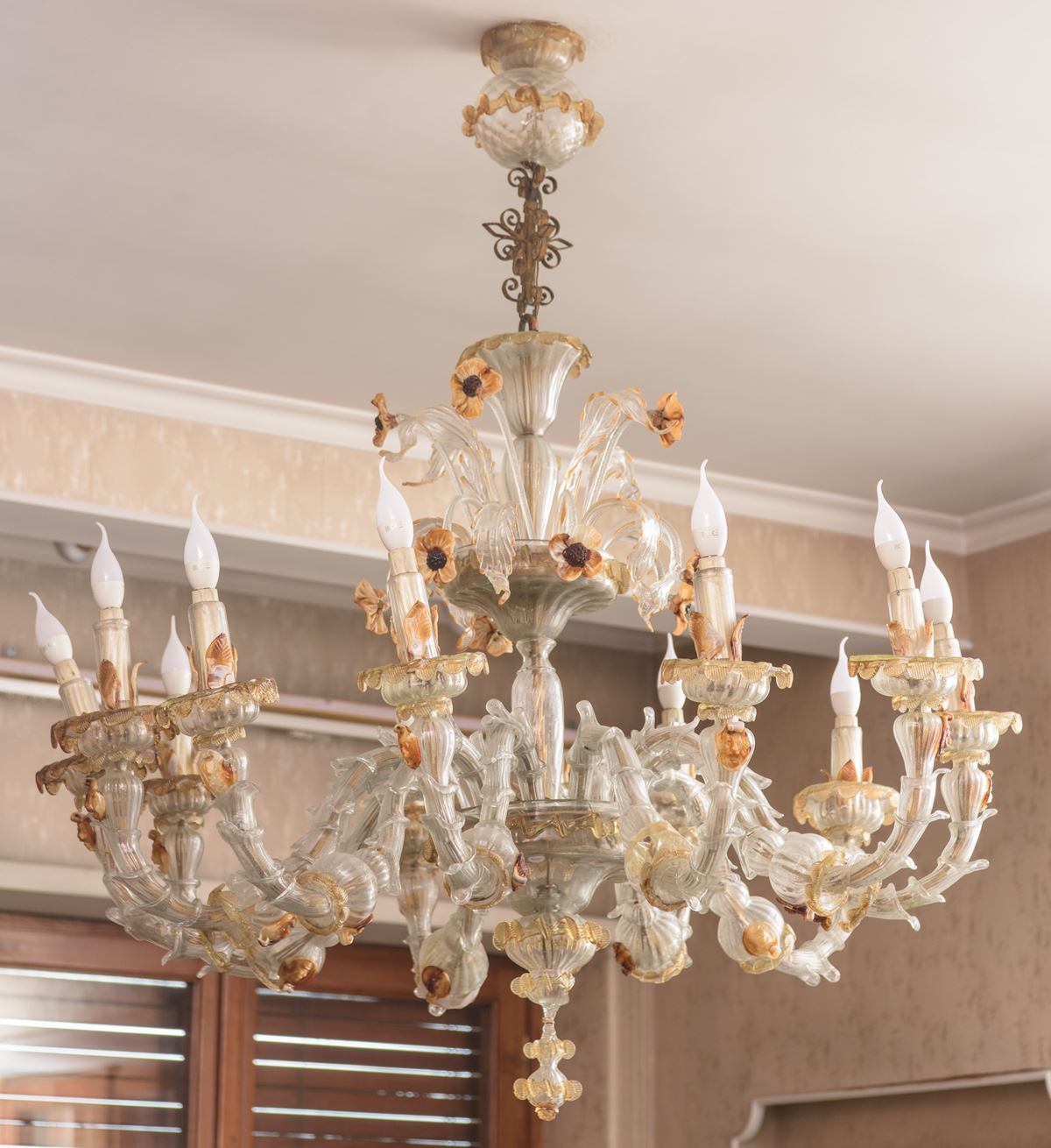 • Lot n° 0104 Importante lampadario in vetro di Murano - Struttura in vetro soffiato e modellato, con 12 bracci sinuosi e ricca decorazione a elementi vegetali e floreali applicati, in vetro trasparente con finiture ambrate. Coppe e bobeches in vetro lavorato, corpo centrale articolato e pendente terminale. DifettiSi precisa che le operazioni di smontaggio, movimentazione e trasporto del lotto saranno integralmente a carico e sotto la piena responsabilità dell’aggiudicatario. - 130 x 100 cm -