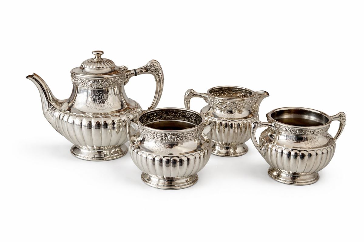 Lotto di elementi per servizio da tè - Composto da: teiera, lattiera, 2 zuccheriere (una senza coperchio).I lotti oggetto della presente asta sono ubicati presso un’abitazione privata sita in Roma.La partecipazione all’asta implica la piena accettazione della condizione secondo cui il ritiro dei beni aggiudicati sarà interamente a cura, rischio e spese dell’aggiudicatario.Resta inteso che eventuali operazioni di smontaggio, imballaggio, trasporto e ritiro dovranno essere organizzate direttamente dall’aggiudicatario.Si raccomanda pertanto di richiedere preventivamente tutte le informazioni necessarie, anche al fine di acquisire eventuali preventivi per il trasporto prima di formulare un’offerta. - h. max 19 cm / h. min. 11 cm - metallo argentato