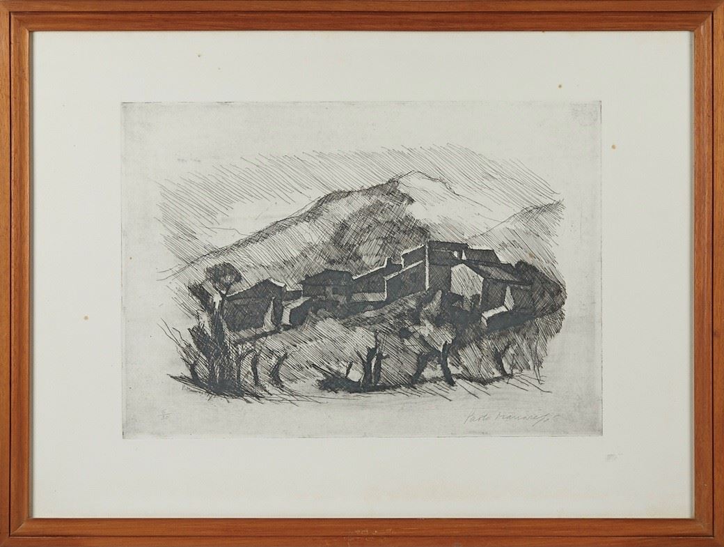 "Case dell'Appennino" - PAOLO MANARESI (Bologna 1908 - Bologna 1991) "Case dell'Appennino". Incisione su carta. Cm 50x70. Opera firmata in basso a destra Paolo Manaresi. Reca numeri di tiratura in basso a sinistra 6/30. Al retro reca etichetta Grafica Studio, Via Farini Bologna. Provenienza: collezione Giorgio Pini, Bologna. - Cm 50x70 - Incisione su carta