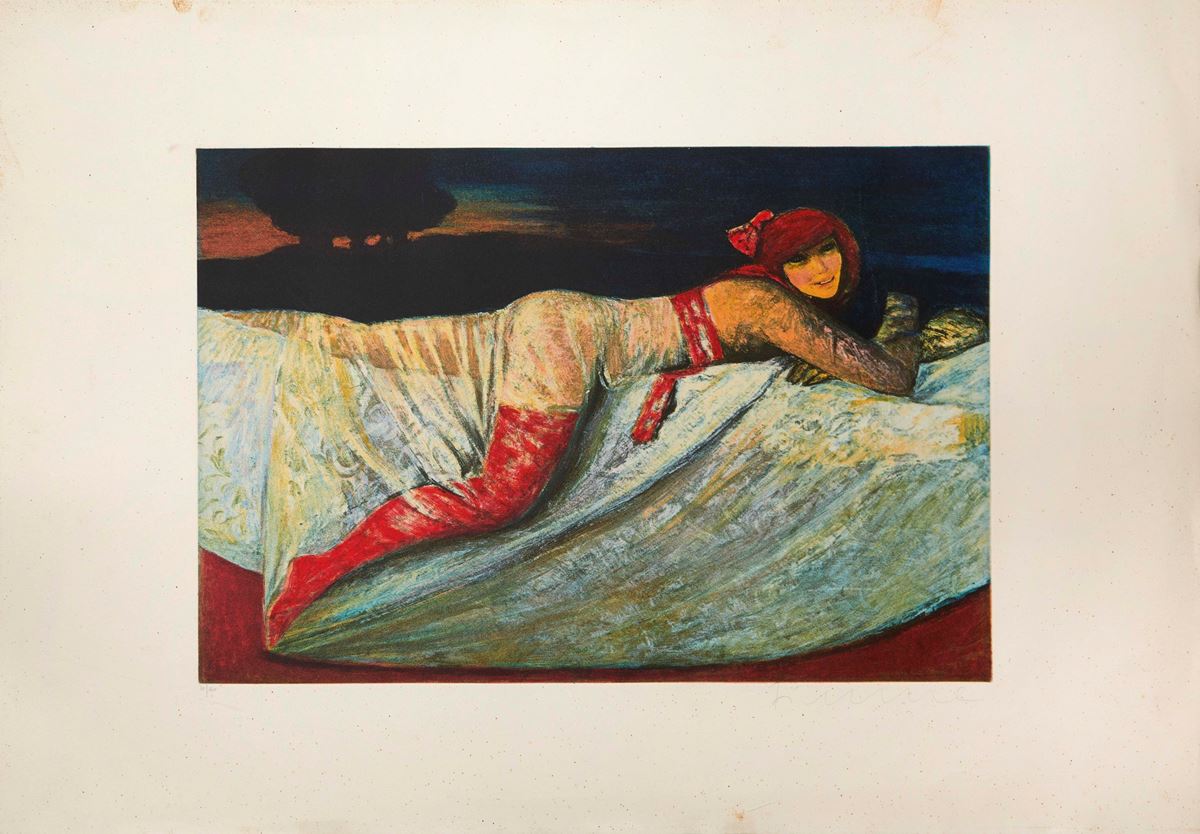 "Odalisca" - SALVATORE FIUME (Comiso 1915 - Milano 1997) "Odalisca". Litografia a colori su carta. Cm 60x80. Opera firmata in basso a destra Fiume. Reca numeri di tiratura in basso a sinistra 111/150 (lievi difetti). - Cm 50x70 - Litografia a colori su carta