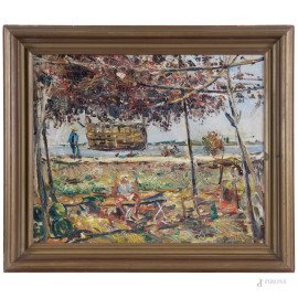 Lungo il fiume, acrilico su cartone telato, cm 49x58,5, firmato in basso a destra, entro cornice