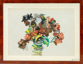 Vaso con fiori, acquarello su carta, cm 48x68, XX secolo, entro cornice