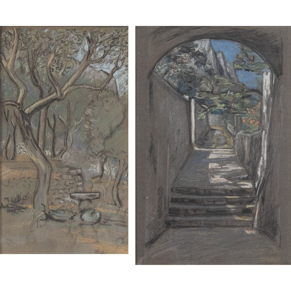 Elihu Vedder - "Vedute di Capri", coppia di pastelli e carboncino su carta, entro cornici - 21x13,5 cm. - 21x13,5 cm. -
