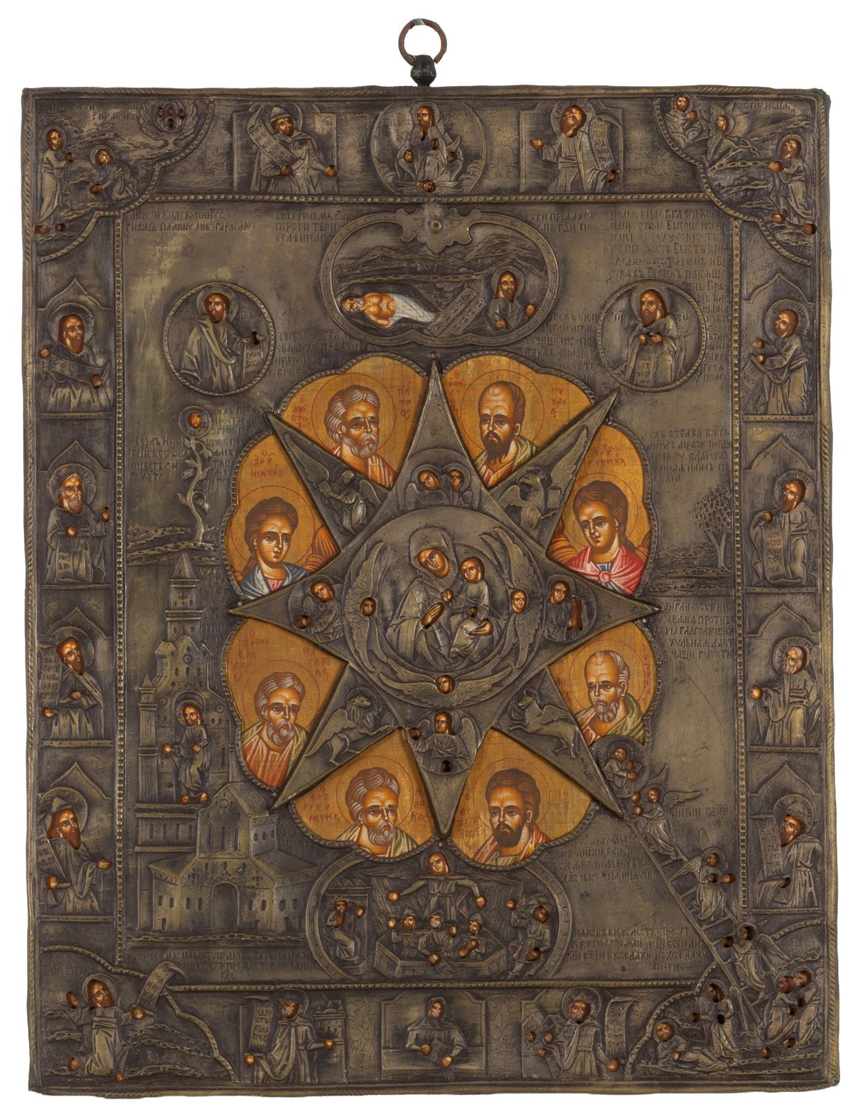 • Lot n° 0136 Icona "ROVETO ARDENTE" - Icona dipinta su fondo oro con riza in rame argentato raffigurante "ROVETO ARDENTE". XIX secolo. - 43x34,5 cm ca. -