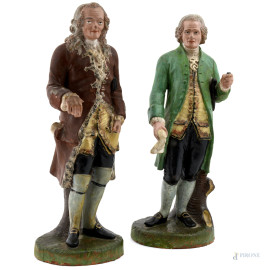 Lotto di due sculture in terracotta dipinta raffiguranti Russeau e Voltaire, XX secolo, altezza massima cm 35(mancanze, rotture e restauri)