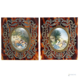Coppia di miniature ovali con scene di genere, cornici in bachelite e decori argentati, sec.XX, cm cornice compresa 15x13,5, (difetti)