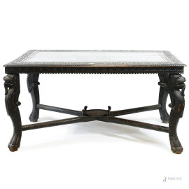 Tavolo coloniale in legno ebanizzato, intagliato a motivi vegetali, con quattro gambe a foggia di fiere raccordate a crociera, sec. XIX, cm 78x152x90. (Difetti)