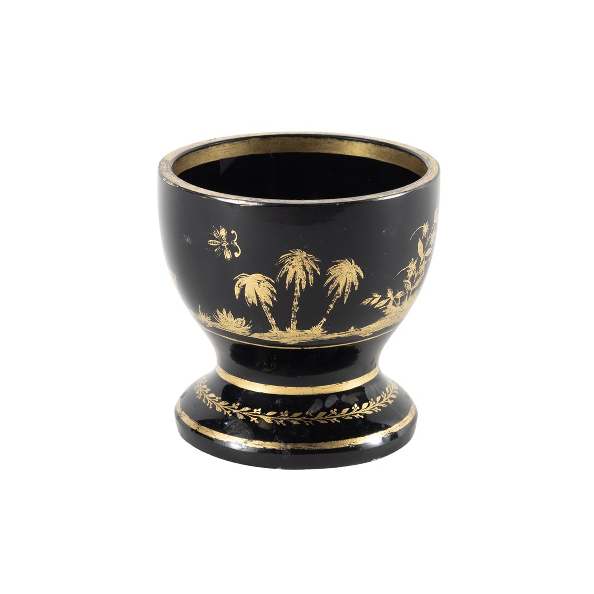 • Lot n° 0270 Piccolo calice in vetro opaco nero - decorato con motivi a chinoiserie in oro, usure e difetti - 8,5x8,5 cm. -