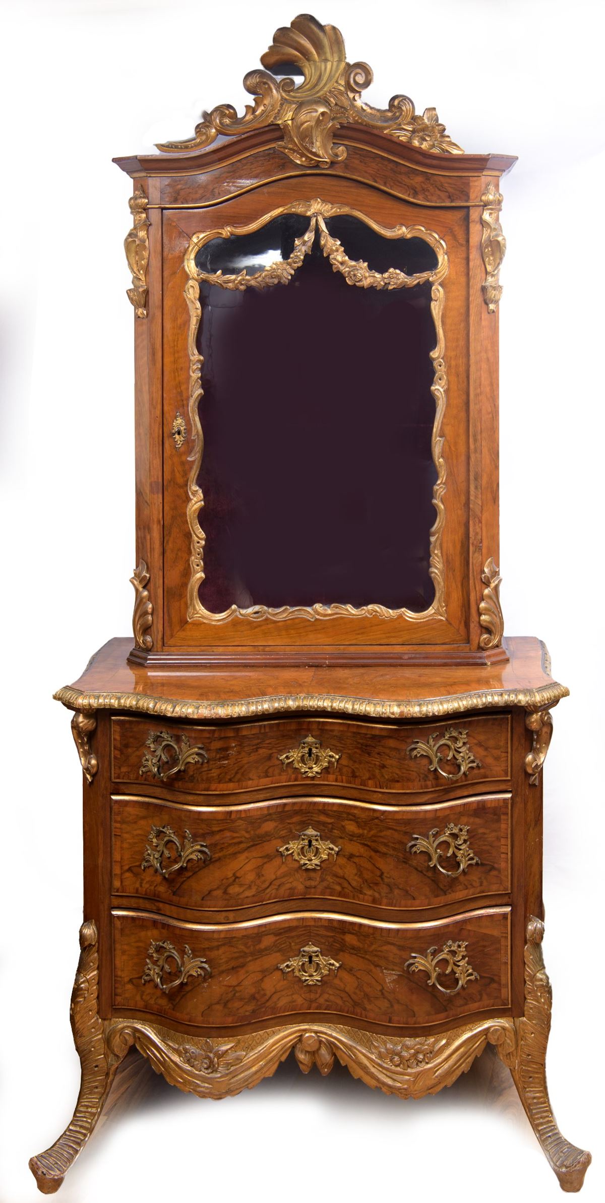 • Lot n° 0138 Cassettoncino con alzata a vetrina - in legno di noce e radica di noce con decori in legno e bronzo dorato, difetti - 210 x 95 x 50 cm -