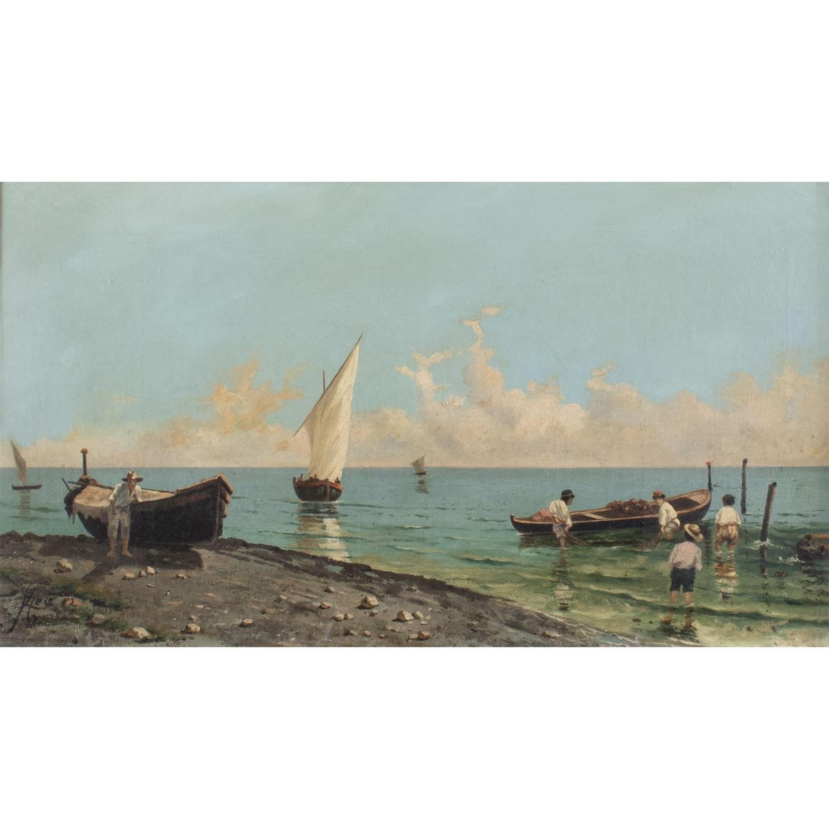 Firma indecifrabile - "Marina", 1882, olio su tela, firmato e datato in basso a sinistra, entro cornice - 32x56,5 cm. -
