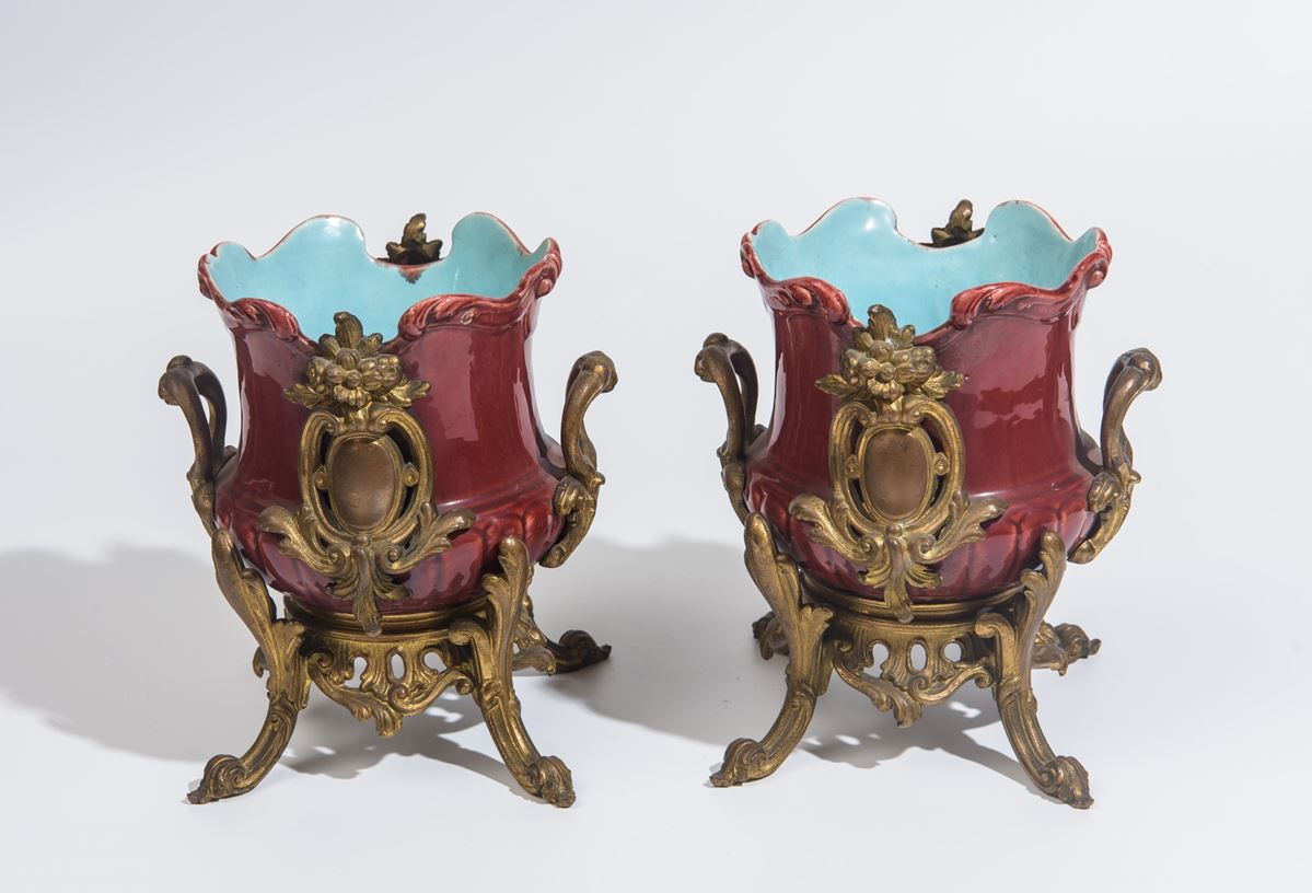 • Lot n° 0110 Coppia di cache-pot - in ceramica smaltata, corpo sagomato a profilo mosso con orlo ondulato, decorazione in smalto rosso con interno celeste, applicazioni in bronzo dorato a motivi floreali e volute; sostegni in bronzo finemente traforati.Si precisa che le operazioni di smontaggio, movimentazione e trasporto del lotto saranno integralmente a carico e sotto la piena responsabilità dell’aggiudicatario. - 25 x 18 cm -
