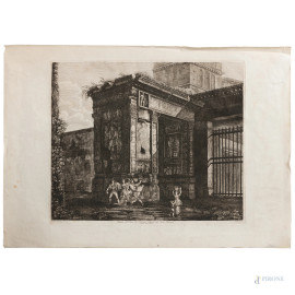 • Lot n° 0329 Luigi Rossini, (1790 – 1857) Veduta dell'Arco di Settimio Severo nel Foro Boario, acquaforte a tiratura coeva, foglio cm 50x71, (segni di usura, piegature, foxing, piccole lacerazioni, tracce di umidità)