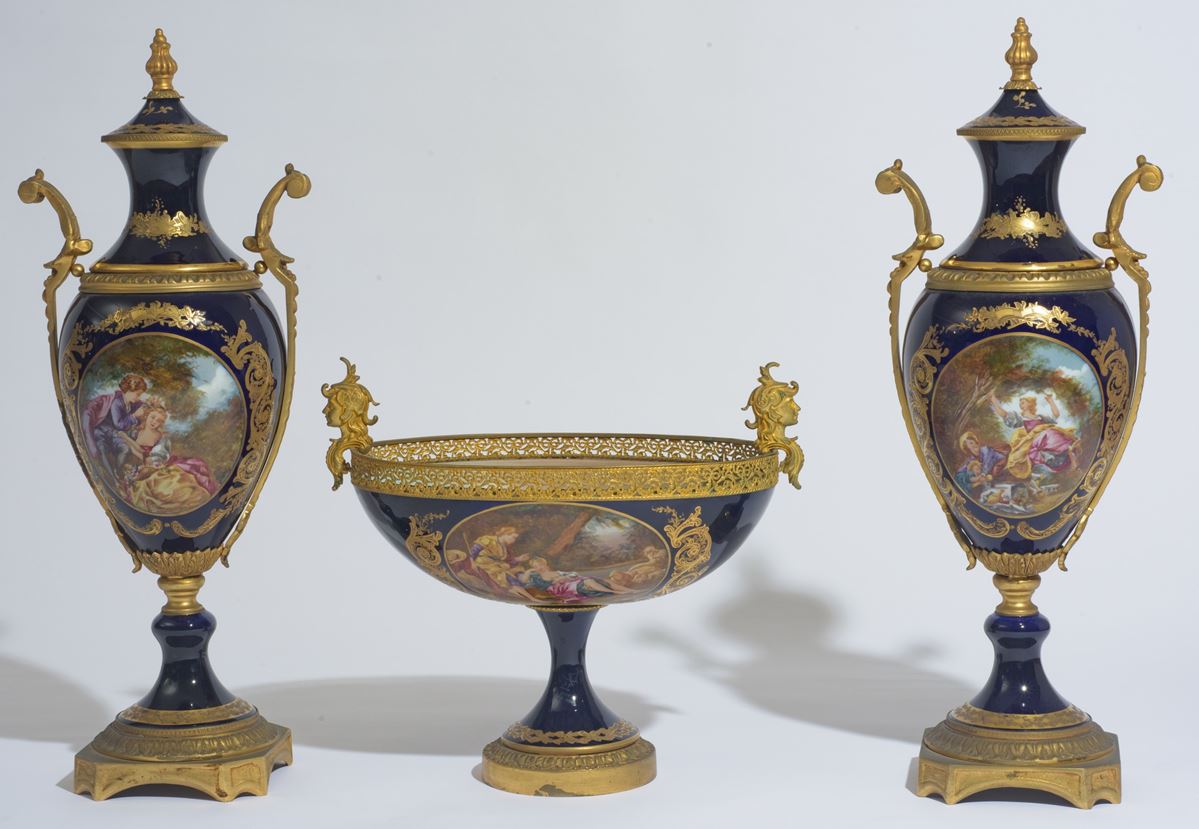Trittico in porcellana - Decorazioni policrome con scene idilliache alla maniera della pittura Francese del XVIII secolo, entro riserve su fondo blu e oro. All'interno mazzolini di fiori e ramoscelli fioriti sparsi. Montature in bronzo dorato. - Potiches H 50 cm; Coppa 23 x 36 cm -