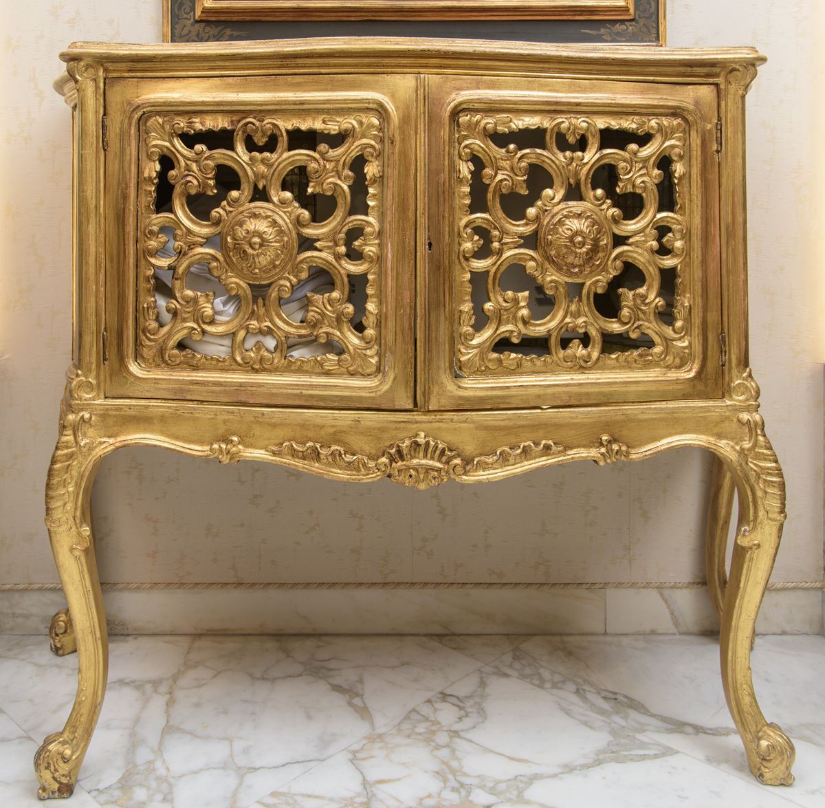• Lot n° 0237 Credenza in stile Luigi XV - In legno intagliato e dorato, a due ante. Fronte mosso con ricca decorazione a traforo simmetrico su ciascuna anta, centrata da rosone rilevato e sviluppata in motivi rocaille e volute. Fianchi leggermente bombati, grembiule sagomato con motivo a conchiglia centrale e gambe mosse terminanti a ricciolo, tipiche del gusto rococò.I lotti oggetto della presente asta sono ubicati presso un’abitazione privata sita in Roma.La partecipazione all’asta implica la piena accettazione della condizione secondo cui il ritiro dei beni aggiudicati sarà interamente a cura, rischio e spese dell’aggiudicatario.Resta inteso che eventuali operazioni di smontaggio, imballaggio, trasporto e ritiro dovranno essere organizzate direttamente dall’aggiudicatario.Si raccomanda pertanto di richiedere preventivamente tutte le informazioni necessarie, anche al fine di acquisire eventuali preventivi per il trasporto prima di formulare un’offerta. - 115 x 80 x 45 cm - legno dorato