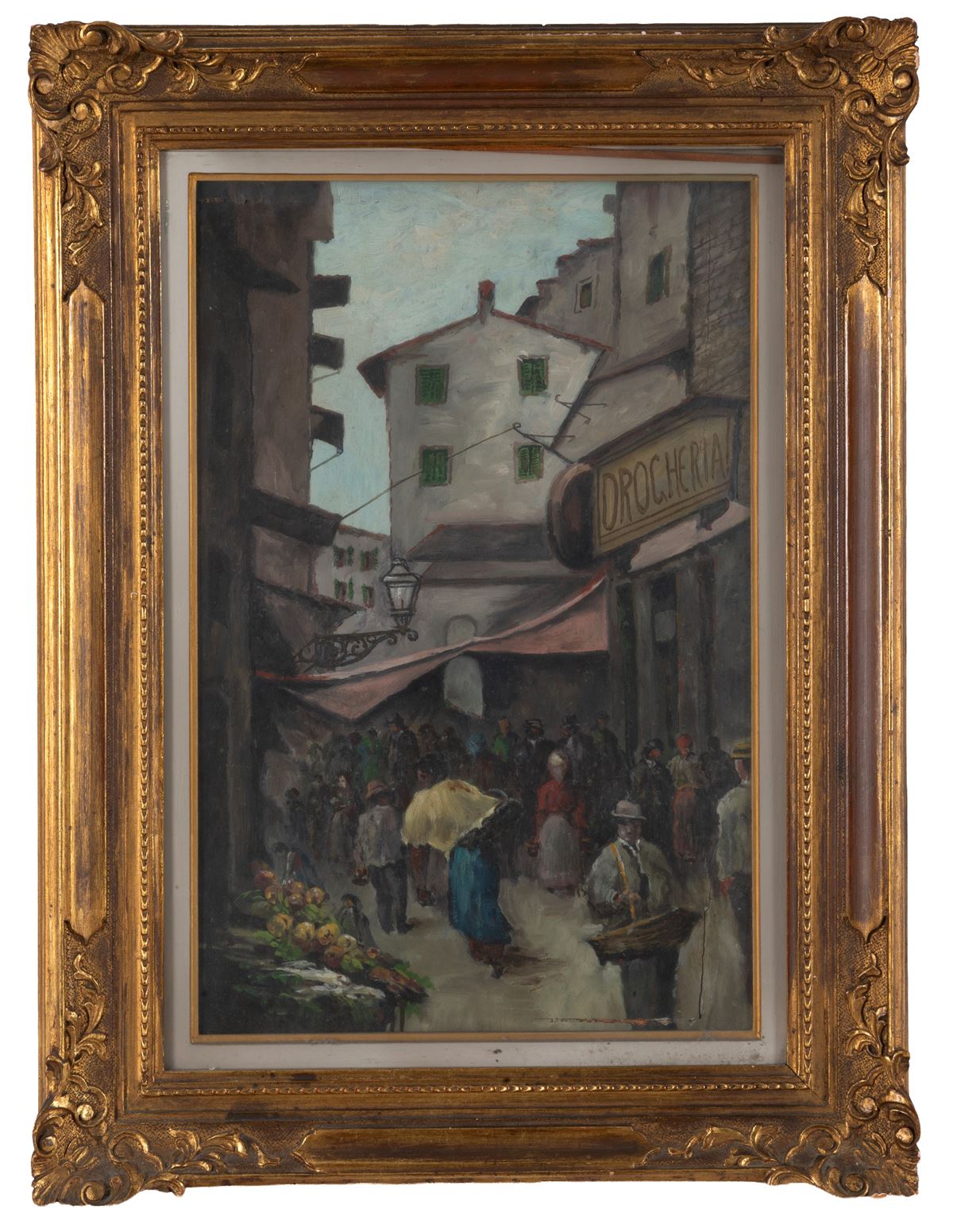 Dipinto "SCORCIO DI VIA CON PERSONAGGI" - Dipinto olio su tavola raffigurante "SCORCIO DI VIA CON PERSONAGGI". Inizi XX secolo. In cornice. Difetti. - 48x30,5 cm ca. -
