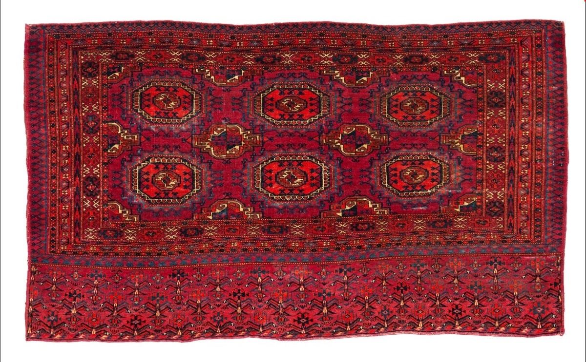 • Lot n° 0312 Tappeto Tekkè Torba. Turkestan Occidentale - Tappeto Tekkè Torba. Turkestan Occidentale. Eccellente stato di conservazione, senza restauri, quattro lati originali, piccolissimo punto basso di vello. - 146x80 cm ca. -