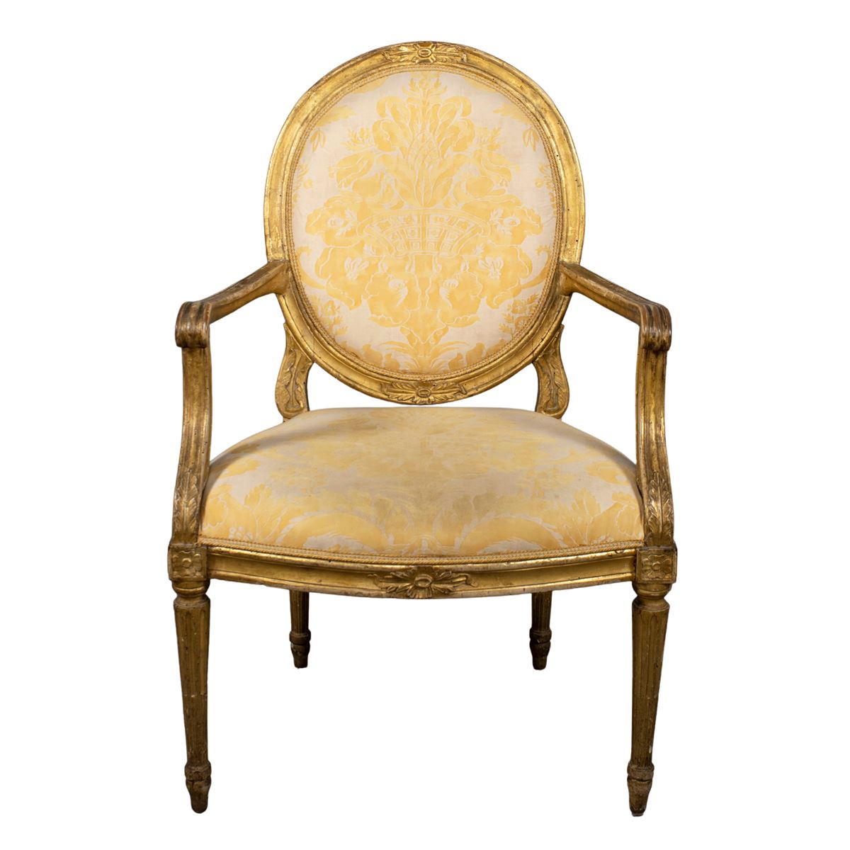 • Lot n° 0330 Poltrona in legno dorato ed intagliato - braccioli terminanti a ricciolo, gambe troncoconiche scanalate, schienale e seduta imbottiti e rivestiti in tessuto - 103x70x51 cm. -