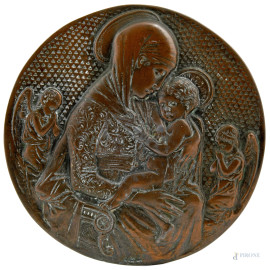 Placca circolare in bronzo raffigurante Madonna con Bambino, XX secolo, diametro cm 21