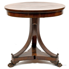 • Lot n° 0491 Tavolo circolare impiallacciato in noce con fusto diramato a triplice arco raccordato da pedana sorretta da piedi ferini, XX secolo, cm 81x80, (difetti)