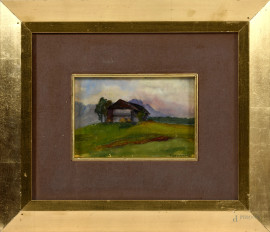 Scorcio alpino, olio su cartoncino, cm 12x17, entro cornice, firmato in basso a destra (piccole cadute di colore)