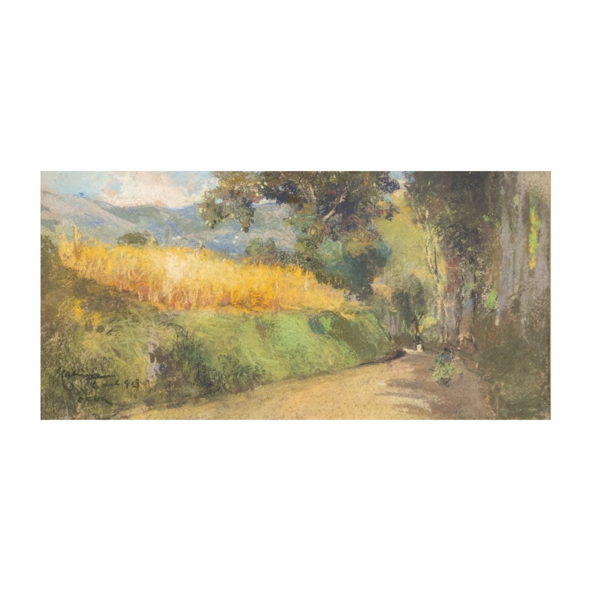 Giuseppe Casciaro - "Scorcio campestre", 1913, pastello su carta, firmato e datato in basso a sinistra, entro cornice - 11x22,5 cm. -