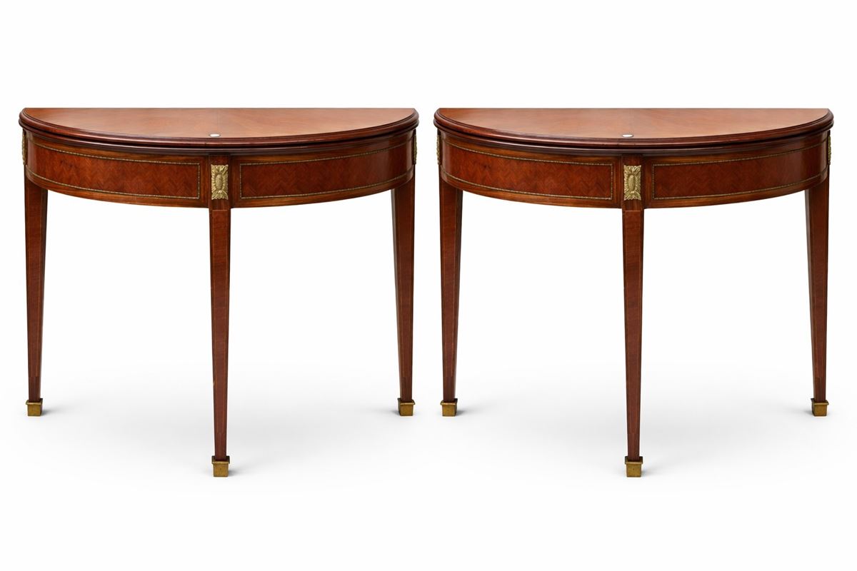 Coppia di tavolini da gioco - in stile Luigi XVI. Diametro aperto: 95 cm.Si precisa che le operazioni di smontaggio, movimentazione e trasporto del lotto saranno integralmente a carico e sotto la piena responsabilità dell’aggiudicatario. - H. 80 x 48 cm -